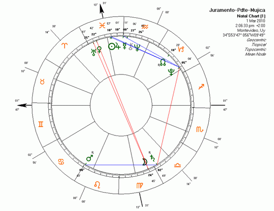 Por fin se hizo un cambio astrológico fundamental en la carta del gobierno de Mujica, lo cual es decir que el período de su gobierno va a tener características bien distintas de los anteriores, y me refiero a los últimos antes del golpe de Estado y todos los posteriores democráticos a partir de 1985. Este cambio de pisada se debe a que el Sol dejó de estar en la casa 9 u 8 del gobierno para pasar a ocupar la relevante y dominate casa 10 y el Medio Cielo (MC). Las diferencias de estas posiciones están claramente explicadas en el artículo ??cambien la hora del juramente presidencial, please!? al cual remito su lectura, clara y breve. Así que me siento sumamente complacido que por los inextricables caminos de Dios, que también opera en internet, la info ahí aportada llegó a dónde tenía que llegar gracias a personas concretas que no puedo nombrar, y si bien habían ajustado bastante el protocolo, a último momento, y sin explicación alguna, como si los corriera algún plazo (como dijo algún locutor en los medios) adelantaron para el asombro de todos la hora del juramento presidencial en el Parlamento, que es el momento clave donde el Presdiente electo queda investido en sus funciones como tal y a partir de ese momento es el Presidente del país y punto. Todo lo demás, la recorrida en el auto eléctrico para llegar a la casa de gobierno, la firma del acta con el escribano de gobierno, el cambio de banda presidencial, la retirada del Presidente saliente, etc, es todo un protocolo ?pour la gallerie? que no tendría razón de ser si antes no hubiera ocurrido el juramento y el Presidente (Mujica en este caso) no fuera ya el Presidente. Y también asombró el adelanto del juramento porque estamos en el país del Ascendente Piscis donde la impuntualidad de los resbaladizos peces es algo considerado normal y una de las signaturas (al menos hasta ahora) de la uruguayidad, o mejor dicho de la uruguayez por el matiz peyorativo implícito. Porque la impuntualidad no es algo de lo cual uno pueda orgullecerse, por la cadena de atrasos y dificultades de todo tipo y en múltiples niveles que termina generando. Además, casualidad o causalidad, en general cuanto más del primer mundo es un un país, más impera y es normal allí la puntualidad. Pero no nos vayamos por las ramas y volvamos a nuestro punto central que es la posición solar en el cenit de la carta del gobierno del ?Pepe?. Lo que determina a su vez un ?cambio de pisada? fundamental que correrá como amplio telón de fondo a través de todos los avatares, positivos y no tanto, que tendrá el país, el gobierno en particular, y por ende nosotros como sus habitantes. Este Sol al mediodía real (no de la hora oficial del reloj) indica un gobierno fuerte, bien plantado, con conciencia de su rol y misión, con sentido de autoridad y con poder. Un gobierno ejecutivo que se orienta a los hechos, las realizaciones, los logros, que las cosas se concreten y culminen. Un período donde importan también los negocios, las empresas, tendiendo a evolucionar favorablemente, consolidarse, hacerse notar, tener emergencia, que van dejando la típica grisalla uruguaya para tener mejor conciencia y uso de sus potenciales y capacidades; o sea, se hacen más fuertes, poderosas. A lo cual se agrega que desde los ámbitos en que se toman las decisiones importantes y se ejerce el poder, desde el Estado mismo hasta el gerente de una pyme, hay mayor conciencia del rol y responsabilidad que la persona tiene, y quiere cumplirlo satisfactoriamente, exitosamente, que se note un buen resultado, que haya logros concretos de alguna manera visible. Así que ?arriba Uruguay! porque el país toma rumbo definido y con fuerza. Como país típicamente virginiano amante de los detalles les doy los datos técnicos que dan origen a esta carta. Las horas fueron tomadas con reloj sincronizado al segundo con uno de los relojes atómicos que dan la hora universal y exactisima a través de internet. Mujica terminó de hacer su juramento a las 14h 05m 55s y enseguida aplaudido, interrumpiendo los mismos la presidenta de la Asamblea General y esposa en la vida real Lucía Topolansky quien proclamó: ?Se?or José Mujica, en virtud de la declaración que usted acaba de pronunciar ante la Asamblea General queda usted investido en la calidad de Presidente de la República? y eso ocurrió a las 14h 06m 33s y ésta última es la verdadera hora a tomar en cuenta. Las palabras reales y lieterales determinan el hecho. Así que insisto, las 14:06:33 es la hora a considerar para este gobierno. Cualquier otra hora, de la firma del acta con el escribano de gobierno, el paso de la banda presindencial, etc etc es relleno protocolar y consecuencia de la anterior investidura. Y no hay otra. Pasemos a ver ahora los lineamientos de este gobierno hasta marzo 2015, que como es algo extenso lo hacemos en varias partes, que aconsejamos lean todas.
