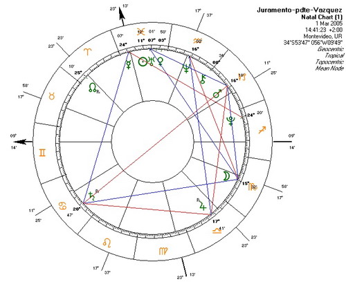 LA CARTA DEL GOBIERNO Como en todos los gobiernos precedentes no solo el Sol está en Piscis (el pescado, ilícitos, límites turbios, sanciones) sino que además en el actual (ver GOBIERNO DE JOSÉ MUJICA 2010-2015 - I) ocupan el signo Venus, Urano, Mercurio y el Medio Cielo (MC). Y en la misma casa 9 del extranjero, exportaciones, leyes y normas está Neptuno (igualmente pescado, sanciones, problemas legales, incumplimientos normativos etiquetas falsificadas etc). En la carta del gobierno de Vázquez, que es cuando saltó pescado en mal estado y se cortaron las exportaciones, Mercurio (el comercio, los enviados, empleados importantes) está exacto al MC en Piscis, haciendo una cuadratura exacta a Plutón (que enseguida dio el conflicto con el hermano-Mercurio argentino y el cierre-Plutón de los puentes-Mercurio), siendo la cuadratura dadora de conflictos y adversidad, pero también de arduos éxitos (la normativa antitabaco, los éxitos contra el narcotráficos, muchos funcionarios estatales y ex jerarcas procesados por distintos delitos), así como fin-Plutón de un comercio-Mercurio relativo a la pesca-Piscis. Y el toque de corrupción que ese poderoso Plutón implica. Neptuno-la pesca, a más de estar en la casa 9 ocupa el signo de Acuario, que es lo internacional, la UE, pero también las amistades, los grupos (fueron todas las empresas impedidas) y la política. En la misma casa 9 está Urano, el agente activo de Acuario, pero en Piscis, cerrando el círculo.