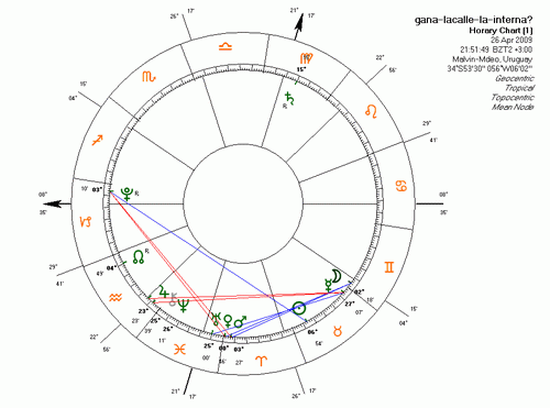 EL PRESENTE Durante abril el panorama dado por las diferentes encuestas pintan un panorama muy auspicioso para Lacalle como futuro ganador de la elección interna en el Partido Nacional. Pero aquí desde la astrología, siempre se tiene la curiosidad de ver las cosas por uno mismo y ver qué no augura el cielo. Así que volvemos al título de este artículo y la pregunta clara y simple es: ?será Lacalle el ganador de las elecciones internas a realizarse en finales de junio? Antes de ir a la carta en sí importa se?alar que hace un par de meses hice una carta que decía que Lacalle no sería el ganador, y ante la evidencia de las encuestas en sentido contrario, quise confirmar, y repetí la pregunta. Para mi sorpresa salió una carta bastante ambigua, que no permitía establecer un juicio con total seguridad. Tres intentos más tuvieron el mismo resultado, intercalados con otros tantos en los cuales directamente no se cumplían los requisitos de validez de la carta, y por tanto no permitían desde el vamos interpretación alguna. Finalmente surgió una carta, válida para interpretar, y con todos los indicadores ahora unívocos y sin ambigüedades. ?Gana Lacalle la interna? se hizo el 26 de abril 2009, a las 21h 51m 49s en Montevideo (Malvín), Uruguaya (GMT + 3h). Veamos lo que nos dice.