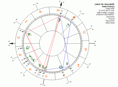 LA CARTA Cumplidos los requisitos de radicalidad, la carta puede ser interpretada. El regente de la hora es la dulce Venus, planeta de artistas y la cultura, y es un artista mayor por quien estamos preguntando. Está nada menos que en Aries, se?alando alguien que está a la cabeza, que sobresale. Pero el mismo signo la debilita hasta el agotamiento por su exilio. Así que desde el inicio vemos que el autor está agotado en grado sumo, no en vano internado. Para más datos Venus es almuten de la casa 3 de los escritos y escritores. Y está conjunta al maléfico Marte, que la domina sin pasarle su energía. En suma, el presente no es nada auspicioso. Pero veamos a Benedetti en sí mismo. Está signado por la casa 7 que se convierte en su Ascendente y hacemos a partir de allí las casas derivadas. Este Ascendente es Cáncer, y como el cangrejo que lo simboliza, indica una avance sesgado, hacia atrás, no es buen augurio. Su esencia es regresión, retorno a la fuente original. El autor está como un ni?o, dependiente en grado sumo, anheloso de su madre, todo regido por Cáncer. Veamos sus almútenes, Luna y Júpiter. La Luna-Benedetti está Libra (el arte otra vez) y entrando en la casa 4 que significa el retorno al hogar, y el fin de la vida, es también el lugar de la tumba. Benedetti vuelve a su casa, lo desea entra?ablemente. Esta Luna en su andar solo se topará con la oposición del maléfico Marte, en plenitud de su fuerza, nada bueno para la salud. Además de por sí indica el retiro del mundo, de no querer hacer ya más nada, no querer figurar ni aparecer más. Porque Marte es almuten de la 10 (la profesión, la fama, etc) y la 5 (la creación). Este posicionamiento lunar en 4 igualmente indica el pasaje a mayor debilidad física, es el punto de su medianoche. El otro almuten, Júpiter-Benedetti, está nada menos que en la casa 8 de la muerte. Como si él mismo buscara o quisiera su fin. Júpiter está en signo de Saturno, que ya vimos al inicio su sentido, y marcha hacia la total unión con Neptuno, planeta de idas, disolución, y enfermedad. Ida paulatina y gradual, al menos de la realidad. Júpiter de por sí es indicador de grandes viajes, y en la casa de la muerte es sin duda el último gran viaje, al otro mundo. El almuten de la 8, la muerte misma, Saturno, se aleja de un vital trígono de la luz solar: la vida naturalmente se apaga. Los signos cardinales dominan, las cosas suceden rápidamente, en días, algunas semanas a lo sumo.