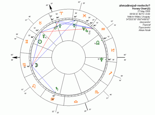 VIENDO LA CARTA El regente de la hora es Saturno, muy descriptivo de todo en el presente. Por un lado refleja mi propio disgusto y temor frente a la posibilidad de que gane. Por el otro nos pinta una situación de rigidez, dureza, frialdad, nada de empatía, cosa vieja, rigor, estrechez, mezquindad, limitación, y otras lindezas similares. Además Saturno es el almuten del mismo Ahmadinejad representado por la casa 7 (y a partir de allí hacemos las derivaciones al convertirse en el nuevo Ascendente), así que todos esos calificativos van derechito hacia él. Podríamos agregar que es resentido, amargo, deprimido, que está solo o es un solitario, a más de muy maniático de ciertos detalles, cerrado, hiperracional, materialista, mezquino, con algún problema crónico de salud, que está en la chiquita, debido a Virgo, donde está Saturno-Ahmadinejad. Este Saturno-Ahmadinejad está en la 8 a la vez que el oscuro Plutón está en su Ascendente: cruel, destructivo, odioso, vengativo. Y nos dice asimismo que está para terminar cosas, fines, conclusiones, cierres, pérdidas, duelos o muertes. Muy bien, pero ?qué pasa con ganar las elecciones? El éxito está signado por Venus, almuten de su Medio Cielo. Venus está en exilio, el punto más alejado de la chance de éxito, el éxito para él más débil no puede estar. Pero aún así podría ganar, sigamos un poco más. Saturno-Ahmadinejad no tiene ni hará relación de aspecto con Venus-éxito así que por este lado, no pasa nada. Es más, Saturno y Venus se reciben mutuamente por caída, que es un pésimo indicador. Pero aún queda la Luna como co-significador de Ahmadinejad y ver si se relaciona con Venus. Pues sí lo hace, pero a través de una cuadratura sin buena recepción, así que el éxito le es esquivo, la Luna estará de crisis con el éxito, un lindo conflicto. Podríamos dejar esta carta acá porque la cosa está clara. Pero alguien podría decir que la Luna hace traslación de luz entre Venus-éxito y Saturno-Ahmadinejad, y es cierto. Pero esta traslación une a Venus y Saturno por un inconjunto, que primero que nada es un aspecto que no se considera en horaria, y en segundo caso si lo consideráramos su nombre mismo ya nos dice que el éxito será inconjunto, no junto, disjunto, no unido, que no le llega a Ahmadinejad. Y otro matiz posible se agrega. La Luna en realidad por su domicilio sería único almuten de la 7, la oposición que tiene, y significa la gente que vota en general, y no significador del actual presidente. Así que esa cuadratura de Luna con Venus significa que la gente, y/o la oposición, no le va a permitir su éxito. Parece que todos los caminos llevan a Roma, ?perdón, estamos en Irán! Por ende...