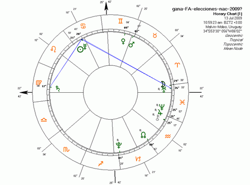 De la carta precedente vemos primero que nada que el regente de la hora es nada menos que el belicoso Marte, pautando la situación presenta como una lucha, una competencia o una guerra, que no es ni más ni menos que la realidad. Esta guerra de partidos estaba relativamente dejada de lado (Marte viene de estar exiliado), ahora se incrementa (Marte peregino está al borde de volverse peligroso) pasando al plano verbal, las comunicaciones (Marte en Géminis), la polémica por ideas y todo corre como pólvora (Marte en 9). Las buenas formas quedan atrás (Venus se le separa definitivamente) y la cosa se pondrá virulenta y con verdadera intención de hacer estragos (Marte luego entra su caída). Sí, pero nuevamente, ?ganará el FA? El FA está representado por la casa 7 y hacemos las derivas a partir de allí. Su triunfo está representado por la casa 10 (de la 7), así que veamos rápidamente los planetas involucrados. El Ascendente del FA a los 23? de Piscis y pegado a él el progresista y liberal Urano a los 26? bien aspectado coincide exactamente con el Ascendente del Uruguay, lo cual no deja de llamar positivamente la atención. También allí está la Luna, índice de las masas que están en y con el FA. A su vez la Luna signa al mismo Frente y nos dice que deja confusiones e incertidumbres piscianas atrás para ponerse las pilas y combatir frontalmente para ganar, al pasar enseguida a Aries, signo del regente de la hora Marte. El almuten y representante del FA es Venus, que evoluciona muy solo en la casa 3 volcado a declaraciones, actuación en los medios, movilizaciones, viajes cortos, multiplicarse para estar por todos lados, actuación en dupla y repetir y repetir. De momento Venus no hace aspectos, pero.... El planeta del éxito es en esta carta Júpiter, almuten de la 10. De momento retrógrado, peregrino, en casa adversa y conjunto exacto al caótico Neptuno, y sin aspectos, no parece un buen augurio. Ni Venus-FA ni el triunfo-Júpiter están en principio conectados entre sí por aspecto en esta carta. Pero (y acá retomamos el pero anterior que quedó en suspenso) resulta que en su movimiento en el cielo Venus-FA se va a unir en muy lindo trígono con su triunfo-Júpiter. O sea, el Frente ganaría. El único y real obstáculo es que antes de eso Venus-Frente hace terrible cuadratura con el maléfico Saturno y podría dar con todo al diablo. Mas nuevamente aquí otro elemento que haría salvable este obstáculo mayor es que Saturno está únicamente bien aspectado y disipa con su sempiterna negativa los temores iniciales de la pregunta. No obstante plantearía un momento difícil antes de llegar al triunfo. En cuanto a fechas resulta que Venus-FA llega a concretar su éxito con Júpiter-ganar en 14?30 aproximadamente, que convertido en tiempo (semanas) es exactamente finales de octubre o ppios de noviembre que es cuando son las elecciones. El mismo día de las elecciones Venus rehace desde Libra el buen trígono con Júpiter en Acuario. El obstáculo y mal momento en este camino sería cuando hace la cuadratura con Saturno luego de recorrer 8?30, algo más de dos meses, o sea la segunda mitad de setiembre o principios de octubre.