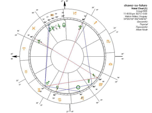 MIRANDO LOS PLANETAS DE LA CARTA El regente de la hora es el Sol, ideal para este estudio, representante natural de presidentes y reyes de por sí, y si está en su real signo de Leo más aún. En la casa 4 se refiere a una realidad nacional, el poder dentro de su territorio. Chávez además es un real nativo de Leo. Por tanto con el Sol en Leo como punto de arranque nos muestra que la carta está bien encaminada. Este Presidente está localizado en la casa 7, que se convierte en su Ascendente (As) y haremos a partir de allí las derivaciones de casas para ver qué nos entra?a su futuro próximo. Está pasando por un período de transición, una especie de intermedio entre una etapa y otra, en la que puede irse a los extremos (nada raro en él) pero que empero tiende a buscar un equilibrio, más consenso, que le sigan la corriente, y hasta algo más diplomático. Porque los vínculos con otros países los tomaría en gran consideración: quiere tener algún aliado. Todo esto por Libra que lo está marcando en este As. Su almuten Venus, en la casa de la ley, el exterior y las ideas, nos da varias pistas. Podría buscar alianzas, acuerdos, convenios y similares con otros países, alguno bastante lejano, y tiene buenas posibilidades para lograrlos, si no es que él mismo de alguna manera los estropea o desde?a, ya que Venus-Chávez tiene mala recepción con el almuten de estos mismos asuntos, el múltiple Mercurio. Las propuestas, respuestas o disposición de otros países extranjeros, y amigos, son muy positivas, da lugar a lindas esperanzas, hasta de tipo comerciales, de intercambio, de servicios, de salud, pero... quizá no se concreten o salgan no tan bien por lo antes dicho, la propia actitud de Chávez. Digamos que por un tiempo hay países amigos que van bien con él, y se hace ruido y noticias de/con eso. Es posible por otro lado, un viaje largo suyo en próximos meses. En lo legal, se ocupa directamente y ejerce su influencia para leyes o normas que él considera sociales o socialistas sean aprobadas. Tienen chances de salir, sobre todo las más chicas. Él tiene proyectos sumamente estructurados de lo quiere próximamente y a largo plazo. Por ahora en lo inmediato tiene suerte, pero Saturno aparecerá, ya le llegará más adelante el turno de ponerle piedras y rocas y en su camino. En lo mejor de su expresión, y ojalá se de, esta Venus daría para normas o leyes que favorezcan la cultura, o la mujer. En cuanto al poder está firmemente asentado en él por buen rato aún: Sol en Leo en domicilio y bien relacionado. Le importa tener una buena imagen, y toda la pompa, protocolo, boato, lujo y magnificencia que su cargo inviste. Y riqueza, que sigue aumentando. La oposición, no le hace mella. Esto por el aspecto con Marte. Termina de pasar un período algo caótico, quizá teniendo que ver con la totalitaria ley de prensa o comunicaciones, que se arroga la potestad de decir lo que es verdad o mentira y las consecuencias para quienes mientan. Él quiere que salga, pero esto parece empantanarse. Si no sale enseguida quizá no salga. Aunque este tema, por su importancia merece una carta horaria por sí mismo, para ver si esta ley terrible sale o no. ?Y qué hay de la pareja o mujeres para él? porque parece importar el tema con Libra en el As, Venus su almuten, y la Luna (su co-significador) entrando en la casa 5 de amores y aventuras... En cuanto al poder, la casa 10 y su almuten Luna, no dan por ahora grandes cambios.