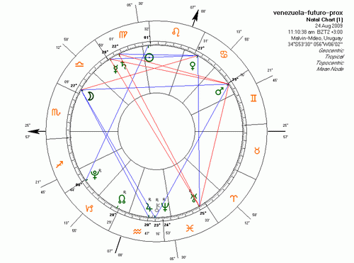 ANÁLISIS Y PRONÓSTICOS La naturaleza de la pregunta hace que ahora el Ascendente de la consultado es el mismo Ascendente de la carta, no haremos derivaciones. El regente de la hora es el Sol y nos dice de forma general que en la actualidad hay: intento de ver más claro en esta situación, el importantísimo rol que juega el Presidente, los juegos de poder y egos bien marcados y abiertos que hay, los intentos de encauzar las cosas, algún logro o éxito en cuanto a lograr un reciente proyecto y esperanzas del Presidente. También este Sol nos dice del protagonismo central que Chávez quiere jugar en un grupo (bien puede ser el de Unasur), la ingerencia o peso que toma en países amigos, y particularmente en Uruguay, ya que este Sol está Virgo el signo de este país. Chávez puede estar de momento realizado porque concreta planes importantes para él, teniendo que ver con trabajo, salud, la administración, servicios. Proyectos que abarcan gran cúmulo de detalles, o implican mayor burocracia. Alguno de sus proyectos se ha realizado hace poco, sobre todo si relacionado con capitales, fondos, colocaciones, préstamos o similares, seguridad social. Pero nada más. Porque en lo inmediato Chávez parece quedarse solo (el Sol vacío de curso), sin los apoyos necesarios, o de alguna manera se debilita su poder realizador. En el grupo de países, salvo algún acólito que le hace coro, puede tener problemas porque no sabe relacionarse con pares, el quiere imponerse sobre otros tan presidentes como él. Y el cielo no favorece al Ejecutivo en cuanto a seguir adelante con sus proyectos porque va a empezar a encontrar cada vez más obstáculos y más grandes para esas realizaciones. Frustraciones, bloqueos, impedimentos, trabas pronunciadas dilaciones es lo que va a empezar a dominar ante la ejecución de su planes y esperanzas. Como que trancado, si no es que le sale el tiro por la culata. Es posible asimismo trabas parlamentarias crecientes y de peso frente a designios del gobierno. La oposición parece tomar más fuerza, por varios motivos: por información, medios de comunicación, ense?anza, temas de inmobiliaria, tierras, la propiedad. Por estos temas parece ser que el gobierno tendrá serios obstáculos.