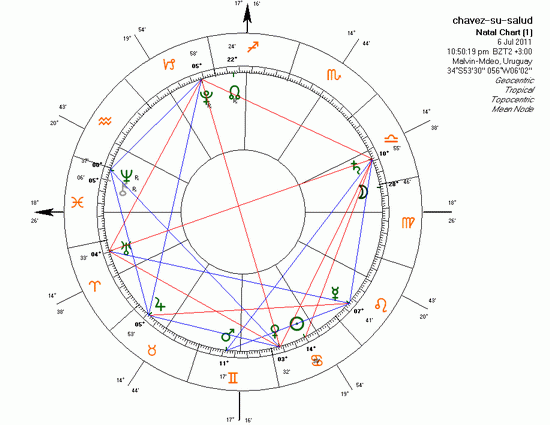 YENDO POR PARTES La carta es pasible de ser estudiada y el regente de la hora es nada menos que Saturno. El maléfico mayor hace una buena descripción de la situación actual, que es seria, de repercusión en el tiempo, que es lenta, que viene de tiempo atrás, que hay mucho miedo e inseguridad a pesar de la exaltación (literal, está en Libra) del momento, que hay riesgo de muerte (como significador natural y porque está en la casa de la misma). La situación actual está de momento equilibrada (en Libra) pero no excluye lindos altibajos aún. Las esperanzas actuales no son tan buenas como pintan al ir de la mano de las enfermedades largas y hospitalizaciones y similares, por ser Saturno almuten de 11 y 12. Saturno cumple bien hasta aquí, así que podemos ver directamente ahora a Chávez. Está representado por la casa 7 y hacemos las derivaciones a partir de allí, el nuevo Ascendente de la carta. Virgo es el Ascendente de Chávez, mostrando bien que sus temas actuales y prioritarios son de salud, y todos los cuidados, estudios, y limitaciones que ello entra?a. La Luna, que también signa a Chávez, en el mismo signo de Virgo reafirma todo eso, y agrega que su salud irá con fluctuaciones, altibajos, mejorías y peorías que se alternan. Esta Luna prominente habla asimismo de viajes, cortos, pero también (almuten de 9) de viajes largos (ver más abajo, los hechos reales ulteriores), o el gran viaje. Esto es de cuidado en temas de salud, porque el gran viaje, es el último viaje, al más allá, ir embarcado en el ataúd. El otro significador de Chávez y su almuten es Mercurio, que en la casa 11 esperanzado anhela y está seguro de su curación. Chávez-Mercurio se pone en mano de sus amigos, que no son necesariamente los médicos (Júpiter almuten de 7), de quienes mas bien se aleja, y no ha sido nada fácil para él tratar y tener que ver con ellos. Mercurio-Chávez va al inmediato sextil con Saturno-enfermedades con recepción ambigua. Chávez recibe bien la enfermedad, sus limitaciones y tener que bajar su desempe?o habitual, pero la enfermedad no obstante lo debilita y da?a. Y acto seguido Mercurio-Chávez hace otro sextil, pero ahora con Marte, el significador de la muerte y operaciones. Como hay buena recepción diría que son operaciones o tratamientos similares, radicales y cortantes. Y aún en sextil posibilidad de muerte. El significador de los remedios y tratamientos prescriptos en esta carta es también Mercurio, que también es Chávez, lo cual hace que este se?or se tome muy en serio todo lo indicado y no deje nada por hacer; en otras palabras, él y los tratamientos se convierten en una misma cosa. La casa de la muerte está ocupada por el benéfico Júpiter, que aparte de viajes al exterior relacionados con el tema, es significador de los médicos, el fin de la vida y la curación misma. Es el fin de estas cosas, estas cosas vinculadas con su muerte, o digamos que finalmente no resultan, salvo en cuanto significación de fin del asunto. Todo ello de una forma benigna, natural, no tenemos que olvidar que la carta natal de Chávez es afortunada, a pesar de todos los pesares. Se muere de exceso de algo, así como ha vivido, de exceso en exceso. Pero el almuten de esta fatídica casa es Marte, el maléfico menor, fortalecido en su ángulo de la casa 10, signa los tratamientos y la lucha contra la enfermedad para evitar la muerte. Pero la muerte es la mejor de las socialistas, a todos nos toma por igual a la vez que nos termina igualando. Ya vimos que vimos que Marte-muerte se va a contactar con Mercurio-Chávez, en sextil bien recibido lo cual suaviza la cosa. Volvamos ahora a la Luna-Chávez y ver el futuro camino en la salud. Lo primero que hace es cambiar de signo, sale de Virgo-enfermedad, para entrar en Libra-altibajos, búsqueda de equilibrio, situación de transición, buen ánimo aparente. Hace una cuadratura con Venus en 10 (mucho dinero en tratamientos, mejorías). Una oposición Urano (discrepancia con médicos, hace lo que quiere, los cambia). Una cuadratura con Plutón (empeoramiento, se asusta, teme lo peor). Un sextil con Mercurio-él mismo y tratamientos (resultan, se obsesiona por las medicinas, dan mejorías). Conjunción a Saturno (enfermedad larga, depresor general, decadencia). Final trígono con Marte-muerte o cirugía mayor.