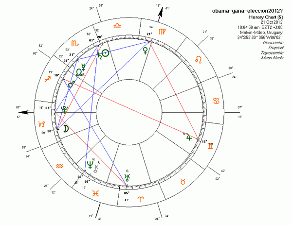 PS. Confesiones de un astrólogo. Como en asunto tan importante quería estar seguro, no me quedé con esta única carta e insistí con otras horarias. La que hice enseguida luego de esta me indicaba que perdía rotundo. Menuda sorpresa, vaya como para no seguir insistiendo. Hice otras dos más. Todas tenían la Luna como regente de la hora, dato importante a notar, revelando la variabilidad de la gente aún. Y todas con la Luna vacía de curso, que amén de prohibir la interpretación de la carta (otro elemento más para seguir insistiendo en la pregunta) significa literalmente ?no pasa nada, nada se puede hacer para que cambie la situación, mucho ruido y pocas nueces?. Hasta que con la última carta entendí que este sentido del vacío lunar significa que no hay cambio! ese no pasar nada es que Obama sigue en su puesto.