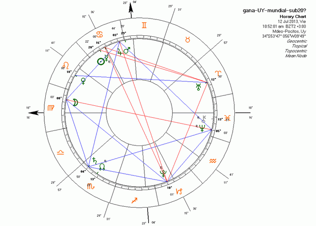 Veníamos astralmente con viento en la camiseta con una carta de lunación muy favorable con el Sol y la Luna, y los benéficos Venus y Júpiter culminando en la casa 10 y el Medio Cielo. Pero la lunación del pasado 8 de julio hizo girar el viento, ya no más las luminarias en el meridiano, sino las nubes y decepciones de Neptuno. Aunque únicamente bien aspectado. Pero astro tan falaz, que se imponía hacer una carta horaria para tener algo más de luz y disipar esa bruma. Muchas veces las cartaa horarias resultan ser tan claras, directas, contundentes, y simples que cuesta admitir de entrada sus respuestas. Es como si la mente precisar más complejidades para saber. Esta es uno de esos casos, donde la respuesta sale impactando de entrada. Por eso no la publiqué enseguida. Para no desanimar. Además también con la esperanza de que podía equivocarme y saliera Uruguay campeón mundial. Inclusive, y con esa ilusión neptuniana fue que traté de retorcer un poco la interpretación y ver si salíamos ganadores. Pero no cerraba este rebuscamiento (del sextil final de Luna con Sol, se verá más adelante). De la carta saltaba fuerte y directamente la verdad. Veamos cómo. El regente de la hora es el maléfico Saturno, y aunque brillantemente aspectado, no es de buen augurio para el asunto que nos importa: alargues, trabas, demoras, logros arduos si los hay, rol de personas mayores, tristeza o seriedad en el mejor de los casos. Es almuten 6 (los detalles, los servicios) y de 5, el juego mismo, que es esforzado, arduo, trabajo, lento. Está en la casa de las ganancias y dineros, y cierto, hay mucho dinero en juego acá. Así que sigamos adelante. El equipo uruguayo está ubicado en la casa 7, y hacemos desde ahí la derivación de casas para ver su relación con su Medio Cielo y su almuten, significador del triunfo. Así Uruguay tiene en esta carta un Ascendente en Piscis, igual que la Carta Natal del país, vaya coincidencia. Signo de los pies, que ha contribuído en nuestra historia a salir campeones mundiales en el deporte de pelota que se juega con los pies. Lindo arranque. En la misma casa 1 está Urano, dando sorpresas, giros inesperados, eventuales accidentes, separaciones, signando lo internacional del evento, y marcando el espíritu deportivo, competitivo y juvenil (está en Aries) del grupo. El planeta significador del equipo uruguayo (almuten del Ascendente) es Venus, benéfico, colocado en la casa 6 y en Leo: el juego da trabajo, el quehacer uruguayo es digno, dan lo mejor de sí, esforzado, por momentos brillante, están con ganas de ser los mejores y alzarse con los laureles, no hay duda de eso. Pero parece quedarse en eso, ya Venus, no tiene aspectos aplicativos por delante, por sí mismo no tiene fuerza para ser un ganador. El significador del triunfo es Júpiter, el almuten del Medio Cielo (desde la 7). Si bien está literalmente exaltado, con mucho entusiasmo, algo inflado, está en la casa 4 del fin de las cosas, del retorno al hogar, y el lugar del cielo más lejano del mismo éxito. Venus-Uruguay y Júpiter-triunfo no se conectan para nada., exepto por una débil recepción mutua por decanato: un peque?o logro pasajero. Nos toca ver la Luna, también significadora de Uruguay. Está también en la casa 6 del trabajo, aunque en Virgo, sin dignidad. Esta Luna-Uruguay en su marcha hacia delante hace un sextil doblemente aplicativo a Mercurio-Francia y en recepción mutua, lo cual nos dice del juego muy disfrutable que habrá, cada uno dando lo mejor de sí.. Luego la Luna-Uruguay conjunta la casa 7 del opositor-Francia indicando que Uruguay de alguna manera estará bajo el poder francés, dominando ellos. Y el final sextil de Luna-Uruguay con el Sol-trabajo y éxito menor, es que habrá satisfacción pero? que no es la cosa final y total (Sol es almuten de 6, dispositor de Venus-Uruguay). (Este sextil final al Sol es lo que podría despistar, ya que el Sol tiene analogía natural con el éxito. Pero aplicando las reglas de la horaria en este caso no va, no es suficiente, no tiene una relación directa con la casa 10 ni Júpiter, ni nada). El éxito mundial es el ya mentado almuten de 10, Júpiter. Y que pasa con Júpiter-triunfo y Luna-Uruguay? Pues nada va a pasar, sino que pasó. La Luna-Uruguay se separa del sextil con buena recepción de Júpiter por unos 4 grados, unos 4 días atrás. Que fue cuando Uruguay ganó el partido anterior. Así que,